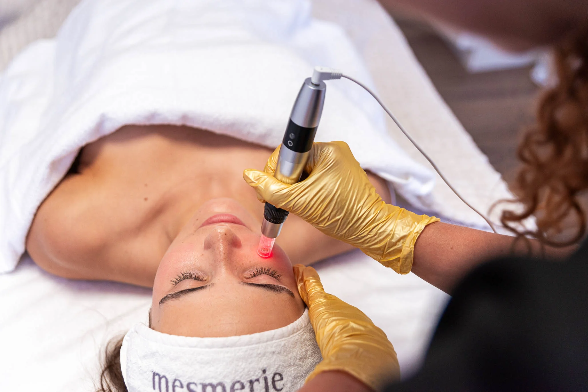 - Pleť je nejprve důkladně očištěna od make-upu, kožního mazu a dalších nečistot. Následuje odmaštění speciálním přípravkem, který zajišťuje optimální kontakt nástavce s pokožkou a rovnoměrné působení celého ošetření.