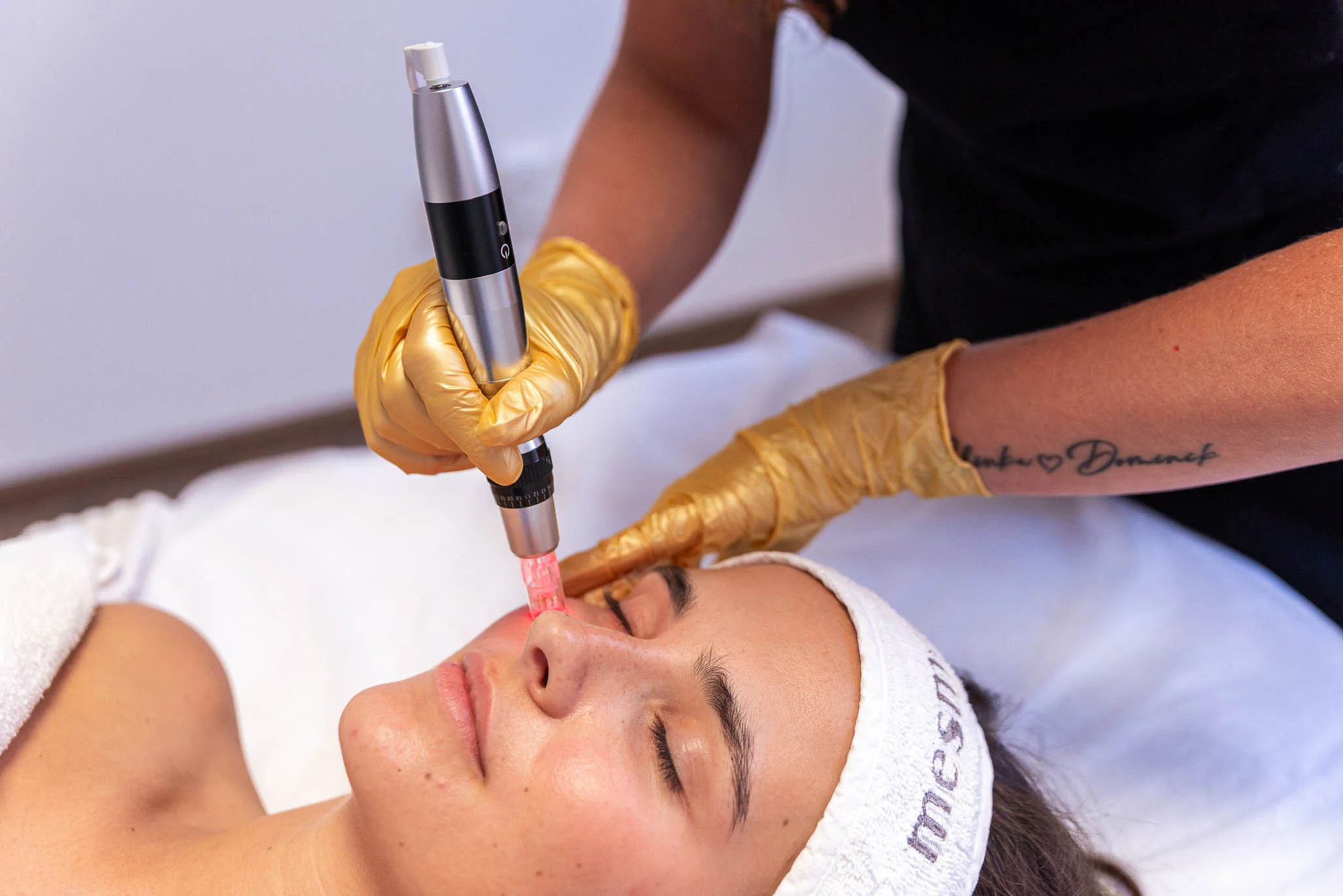 - Po ošetření jednotlivých oblastí je na pleť aplikován sterilní sérum s vysoce koncentrovanými účinnými látkami. Díky vytvořeným mikrokanálkům dochází k jejich hlubšímu průniku do vrstev pokožky.